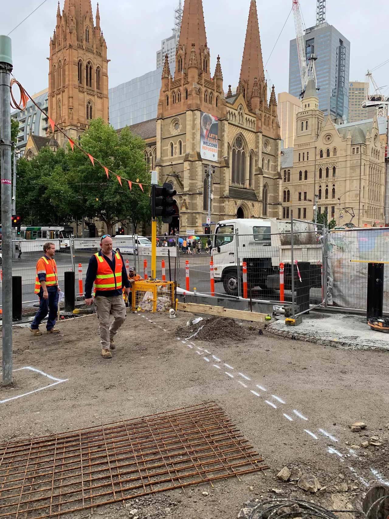 GP Bluestone is proud to have been chosen as the preferred contractor in the installation of protective barriers at Flinders Street in Melbourne. Following the horrific attack where a vehicle rammed pedestrians, this was the first such installation of its kind in the Southern Hemisphere. With high tensile steel bollards installed deep into the ground, the bollards are rated to withstand the impact of a heavy rigid vehicle.